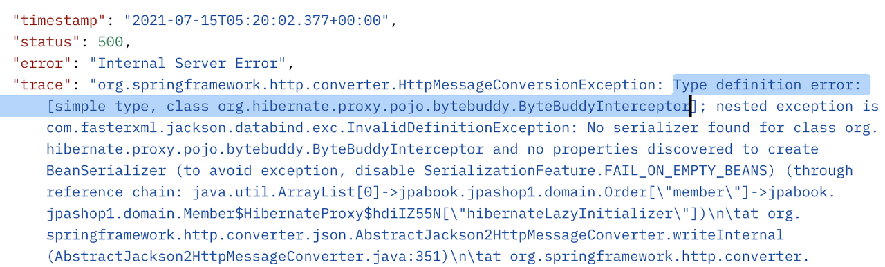 Order 엔티티의 Member, Delivery는 지연 로딩이 걸려있다. 지연 로딩이란 해당 값에 null이 아니라 가짜 프록시 객체를 생성해서 넣어준다. 이후 필요할 때 해당 객체를 실제 DB에서 꺼내오겠다는 의미이다. 하지만 jackson 라이브러리 (객체를 json으로 변환하는 역할)가 프록시 객체를 어떻게 처리해야 하는지 모르기 때문에 에러가 발생한다.